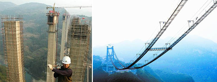 Building West Hubei and Shanghai Chengdu Expressway Bridge - some 1365 meters in length, towering 650 meters over the bottom of the gorge (images via)
